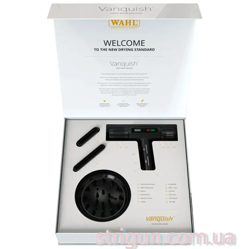 Wahl Vanquish выполнен в компактном и удобном корпусе. Хорошая балансировка по весу – 340 грамм, не дает нагрузки на кисть руки, что очень важно, когда вы используете фен. Сетевой шнур длиной – 3 метра дает хорошую степень свободы. Также модель оснащена петелькой для подвешивания, что позволит в любой момент повесить фен на крючок. LED-экран делает управление феном удобным и удобным. Предпочтительные настройки можно сохранять благодаря наличию памяти.