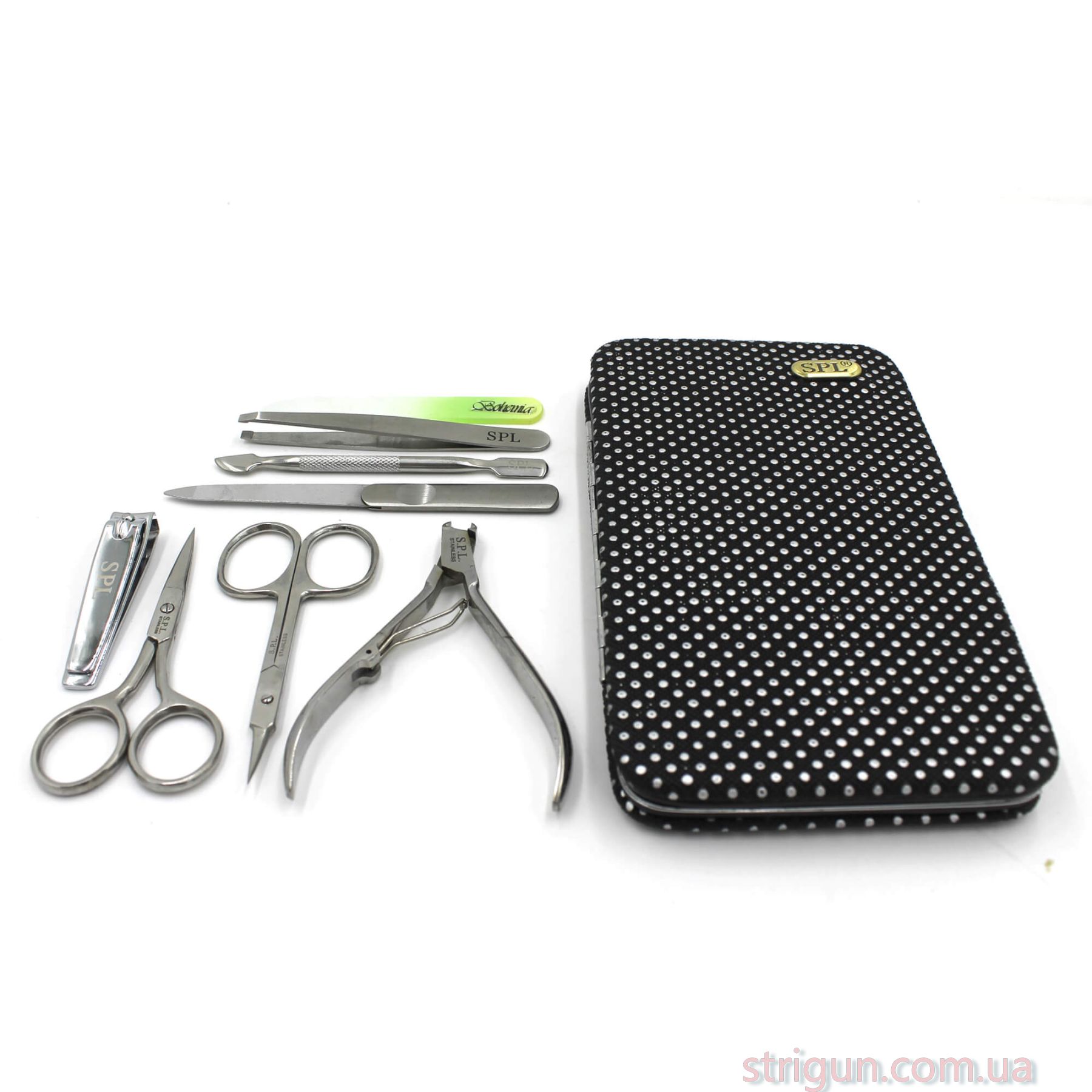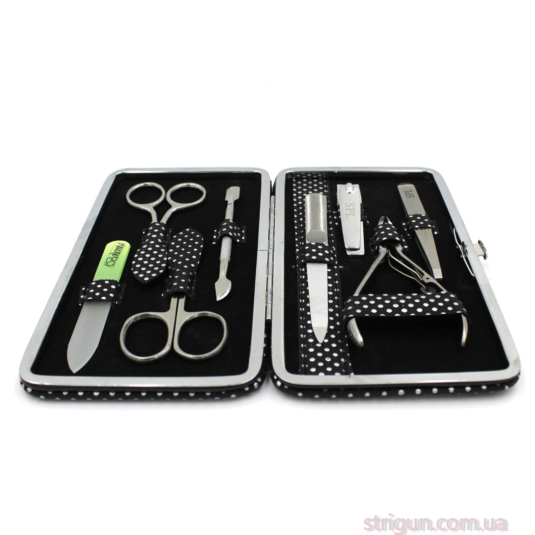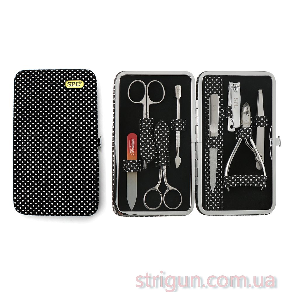Хорошие ногти – важная составляющая элегантного образа как женщины, так и мужчины. Поэтому работа с ногтевыми пластинами является одним из важнейших этапов ухода за собой. Чтобы процесс прошел максимально комфортно, результат оправдал все ожидания, воспользуйтесь набором маникюрных инструментов от бренда SPL. Комплект содержит 8 качественных изделий, укомплектованных стильным чехолом. Компактные размеры футляра и высокая эффективность аксессуаров сделают использование приятным и безопасным. Особенности:Хороший чехол в горошке;Острое заточение инструментов;изделия из медицинской стали;Ножницы с прямыми кромками предназначены для работы с ногтями;Ножницы с острыми кончиками обеспечивают комфортную обрезку кутикулы;Кусачки позволяют усовершенствовать околоногтевую зону;Пинцет со скошенными кромками поможет создать хорошую форму бровей;Шабер будет уместен для ухода за кутикулой и снятия гель-лаков;Книпсер гарантирует ровный срез ногтей на ногах;- 2 пилочки – запил и шлифование ногтевых пластин.