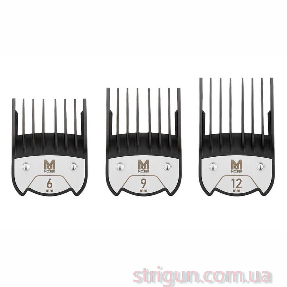 В набор премиальных магнитных насадок Moser Magnetic Premium Attachment Combs 1801-7000 включены 6 гребней: 1,5, 3, 4,5, 6, 9 и 12 мм. Насадки сделаны из прочного усиленного стекловолокном пластика и металла. Пластик устойчив к химическим составам, применяемым в салонах красоты или парикмахерских. Гребни легко крепятся на нож машинки механизмом MagClick® со щелчком и не соскакивают во время стрижки. Гребни совместимы со всеми ножами Moser серии 5 в 1: Magic Blade, Magic Blade II, Diamond Blade, Fading Blade, Blending Blade и ножом для стрижки животных Magic Blade Coarse. Закруглённые края зубцов плавно скользят и не царапают кожу во время стрижки. Зубцы насадок имеют разную геометрию для улучшения результатов стрижки на каждой высоте среза. На верхней стороне насадок крупными цифрами указана длина стрижки в миллиметрах. Крупные обозначения упрощают выбор насадки с необходимой длиной. В комплекте с гребнями идет разворотная подставка с шестью отсеками и прозрачной крышкой.